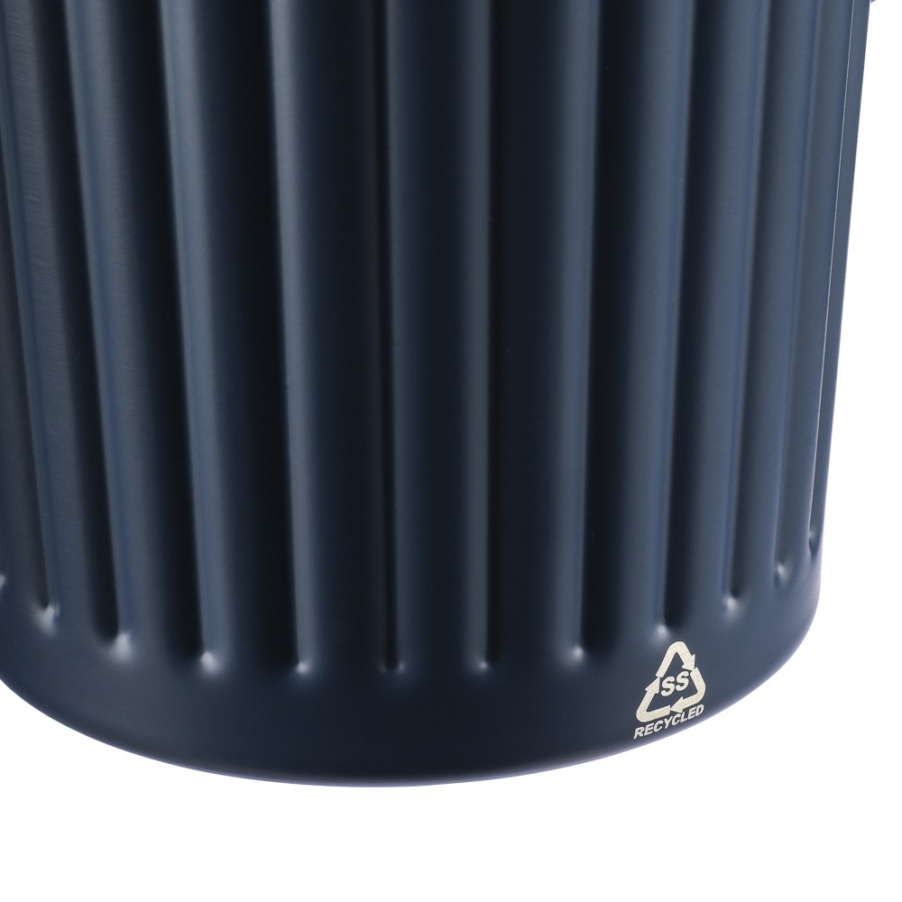 Újrahasznosított rozsdamentes acél útibögre, 450 ml. A belső 304-es, a külső 201-es rozsdamentes acélból készült, bordás markolattal és masszív fogantyúval, műanyag, csúszózáras fedéllel. Gravírozott újrahasznosított logó található a bögrén. Csomagolása barna papírdoboz.