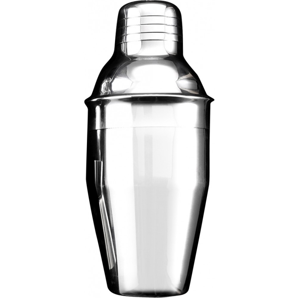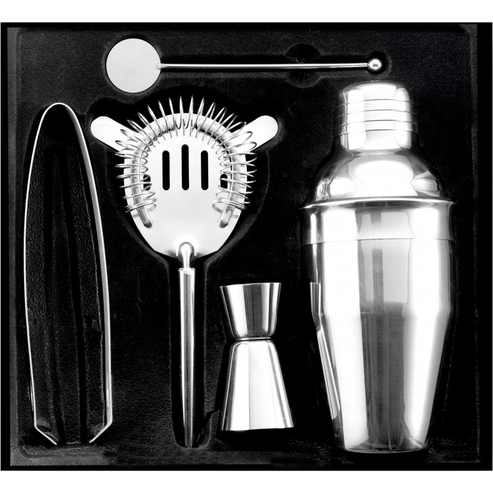 Koktélos készlet díszdobozban. 0,25 literes shaker, jégkockacsipesz, kanál, szűrő és mérőpohár.