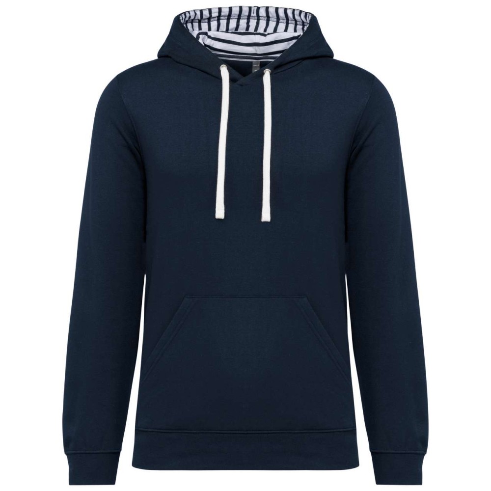 80% fésült pamut/20% poliészter. 3 fonalú pamut. Karcsú szabás. Egyenes ujjak. Kenguru zsebek. Félhold alakú betét a nyakkivágásnál, hogy megkönnyítse a díszítéshez való hozzáférést a nyakkivágás belsejében. 1x1 bordázott mandzsetta és szegély. Tematikusan nyomtatott pamut trikószövetből készült, kontrasztos húzózsinórral bélelt kapucni. Letéphető márkacímke.