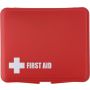 Elsősegélykészlet piros műanyag dobozban. Tartalma: 5 db ragtapasz, olló, 2 db alkoholos lap stb.