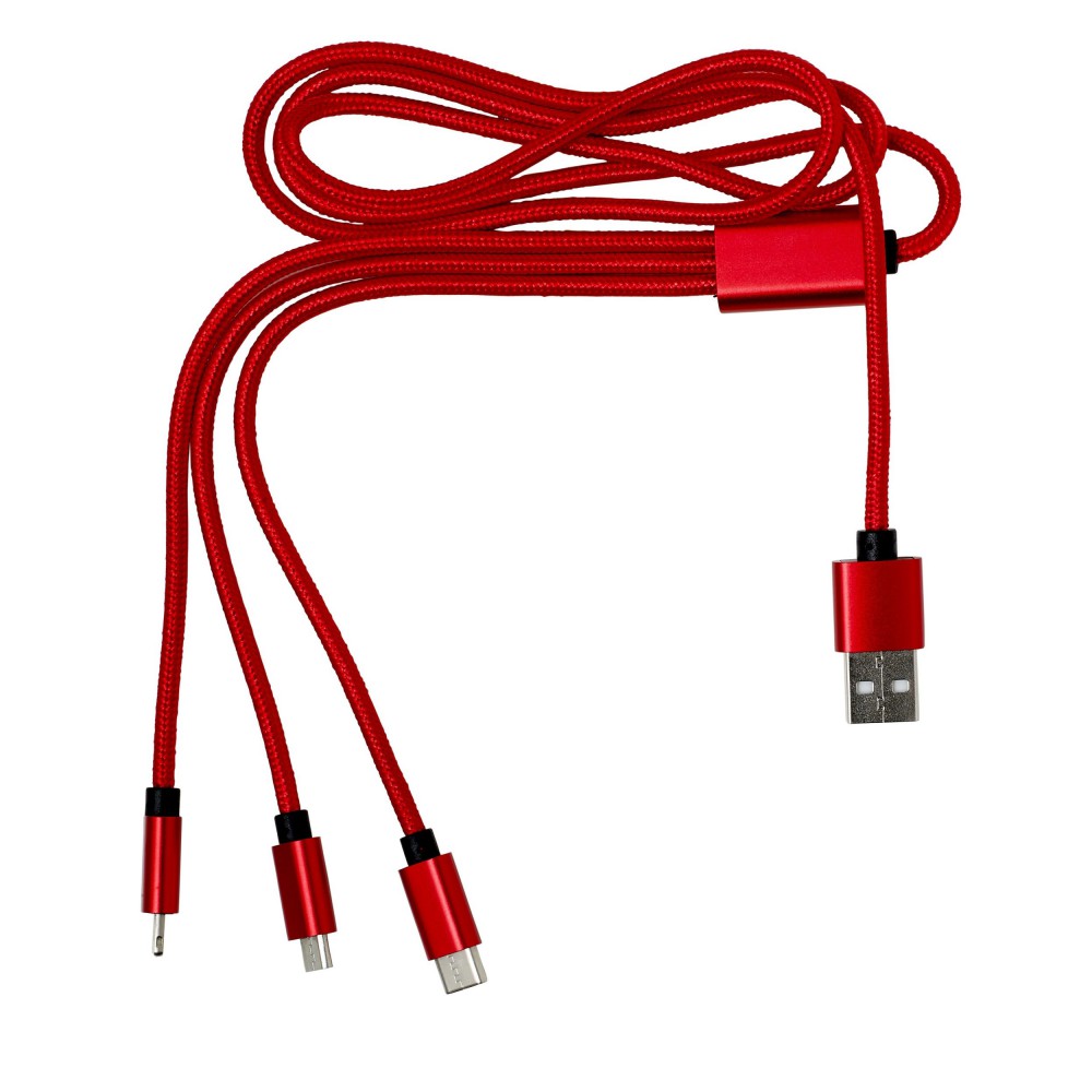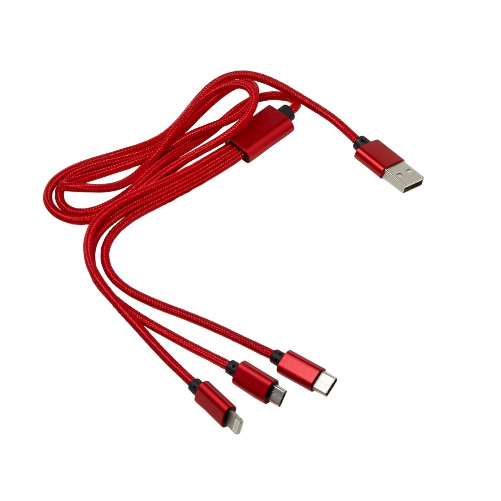 Töltőkábel az egyik végén USB csatlakozóval, a másik végén mikro USB, USB-C és Lightning csatlakozókkal. Nylon.