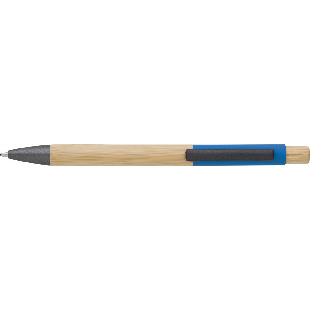 Bambusz golyóstoll alumínium kiegészítőkkel, kék tollbetéttel. Grafit színű hegy és klipsz, bambusz nyomógomb.