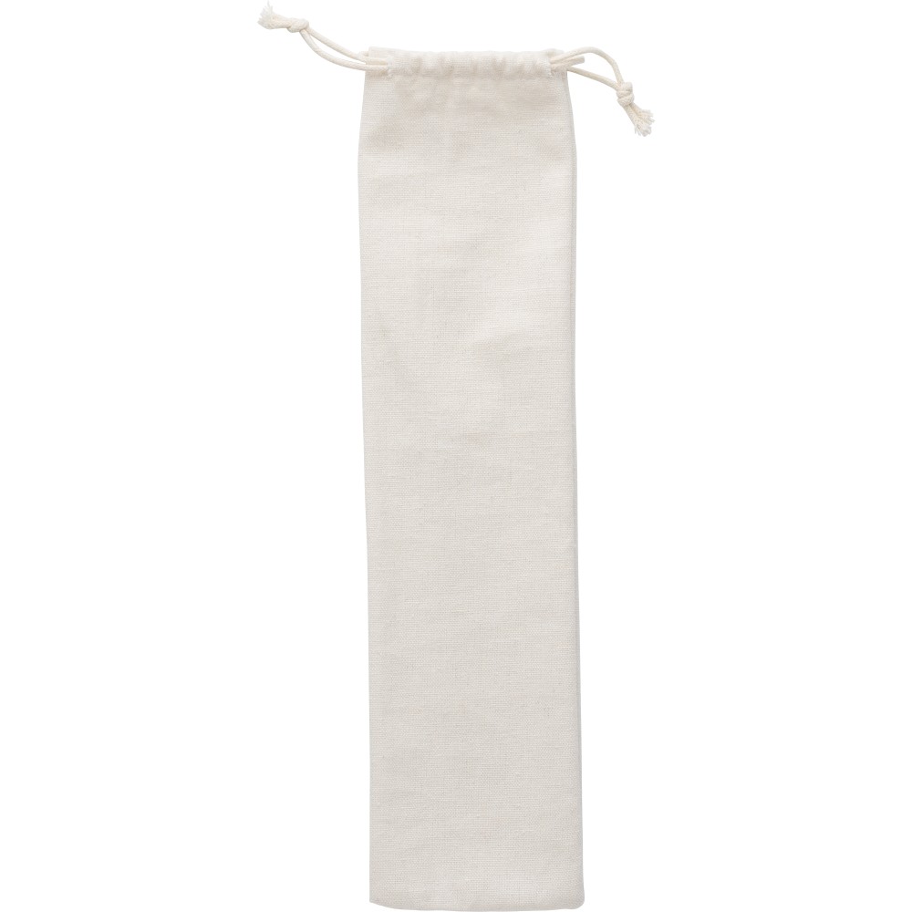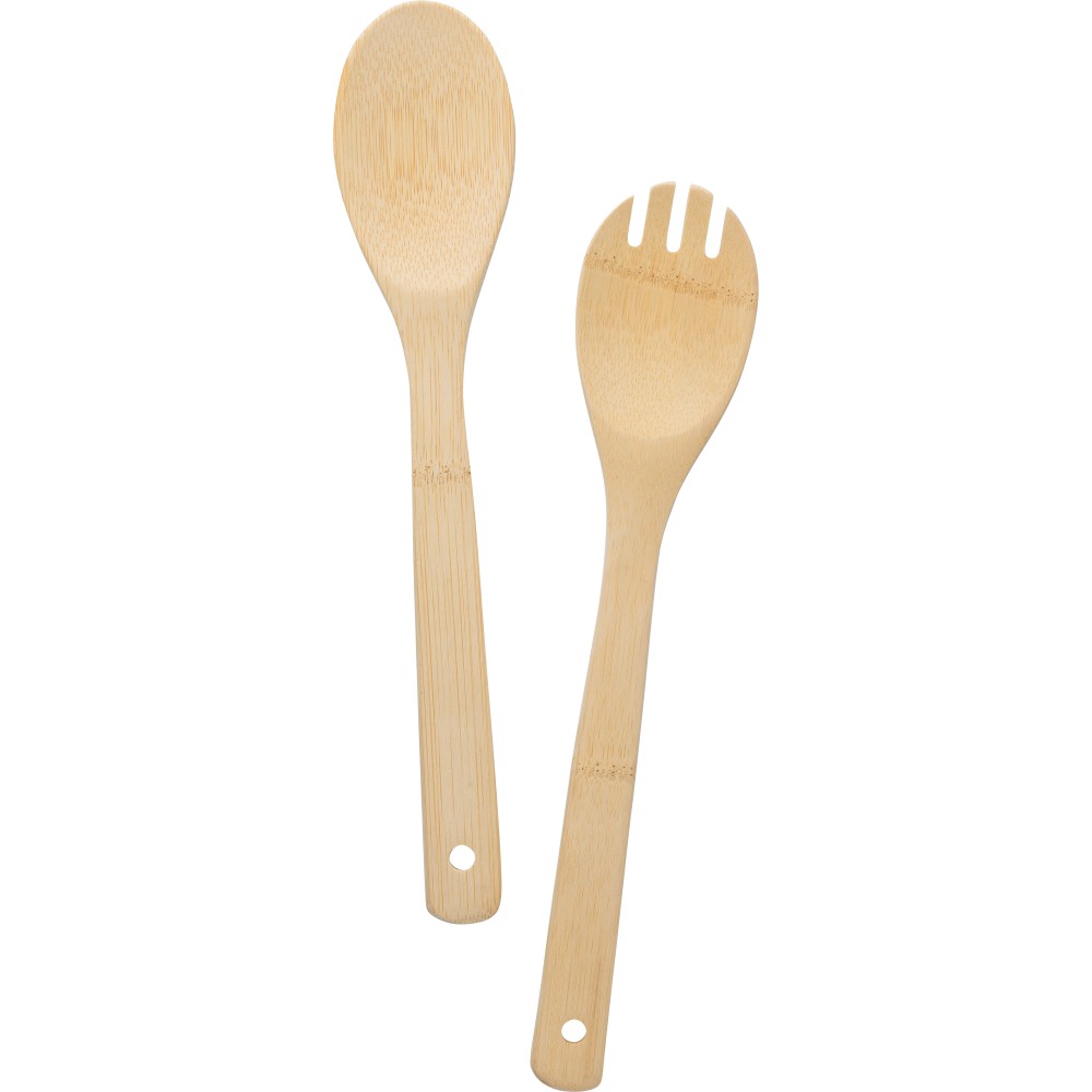 Bambusz salátás evőeszköz. Az evőeszközök nyelének végén lyukakkal van ellátva. Pamut zsinórral húzható tasakba csomagolva érkezik.