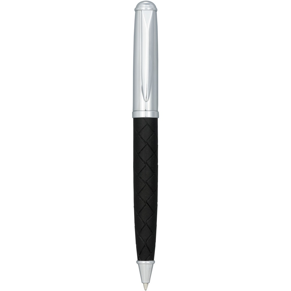 Gömbölyded golyóstoll, alsó része bőr mintázatú dekorációval lett ellátva. Prémium minőségű fekete tollbetéttel. Csomagolása Luxe ajándékdoboz. Fém és műbőr.