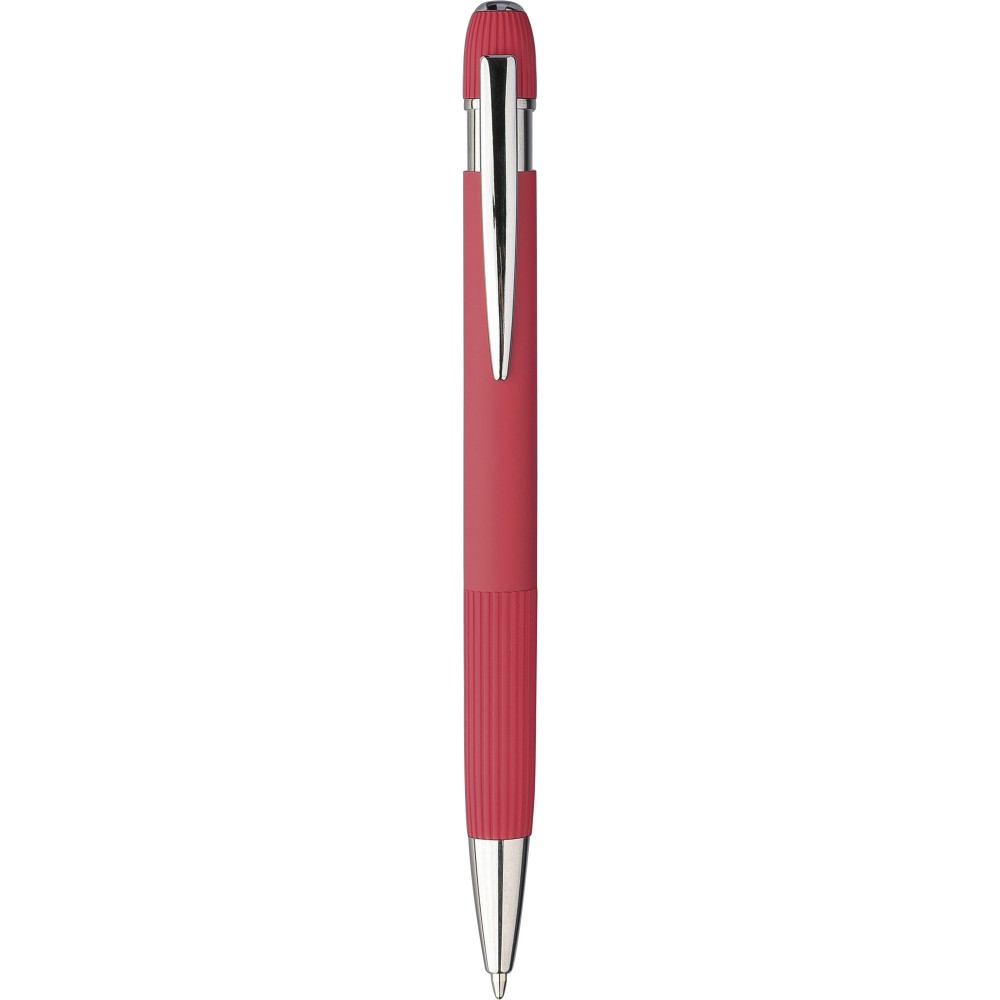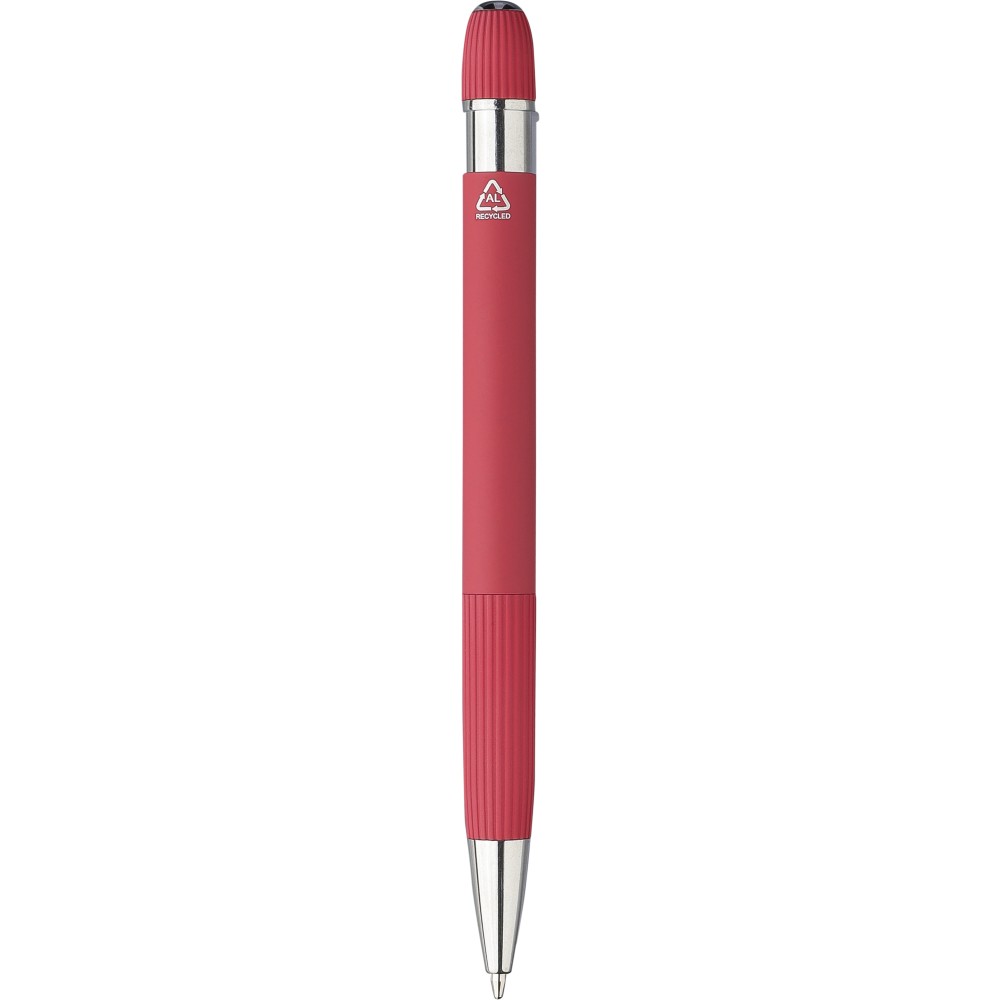 Újrahasznosított alumínium golyóstoll gumírozott felülettel. Bordázott részletekkel a markolaton és a tetején, krómozott műanyag heggyel és fém klipsszel ellátott nyomógombbal. Lézergravírozott újrahasznosított logóval. Kék tintával.