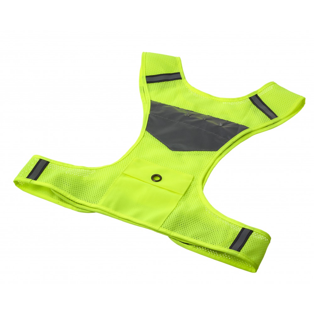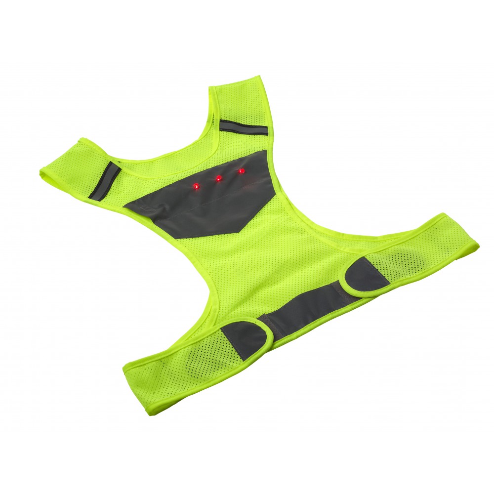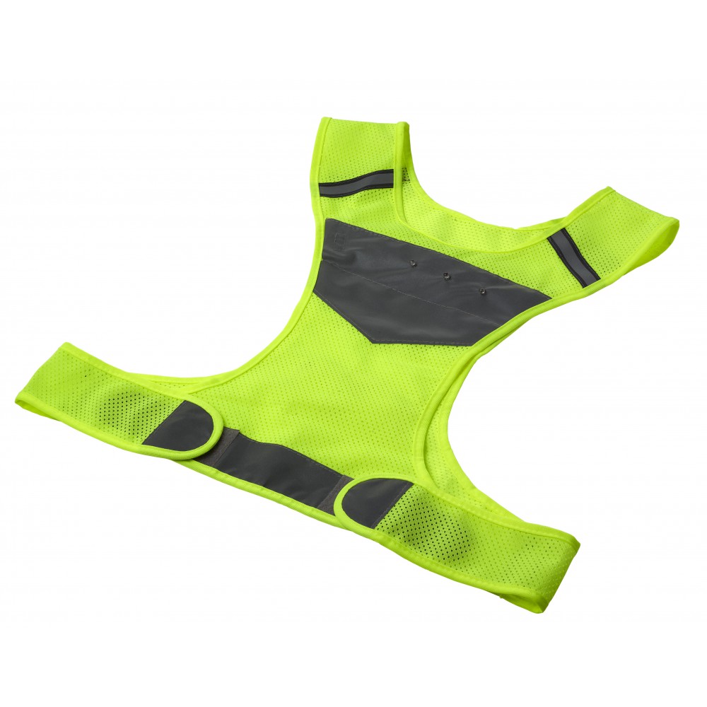 Fényvisszaverő hálós mellény 3 fénnyel. Az elemet tartalmazza. Promóciós célú felhasználásra. Nylon és poliészter.