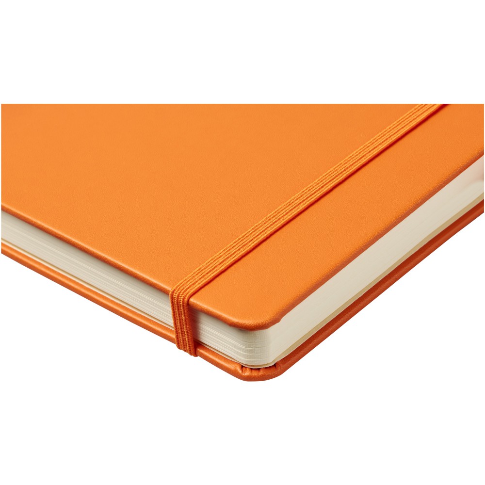 Műbőr A5-ös (14,2 cm x 21,4 cm) jegyzetfüzet gumiszalaggal, szalagjelölővel, tollhurokkal és harmonika hátsó zsebbel. 96 db vonalas krémszínű lapot tartalmaz (80 g/m2).