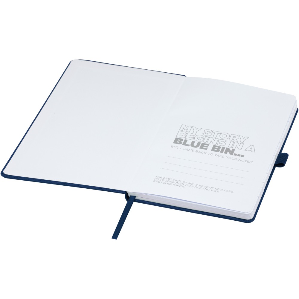 A5 jegyzetfüzet újrahasznosított PET műanyagból készült szövet borítóval. 80 lap 70 g/m2 újrahasznosított, vonalas papír, tolltartó hurok és szalag könyvjelző. Kombinálható a 107757 Honua RPET golyóstollal.