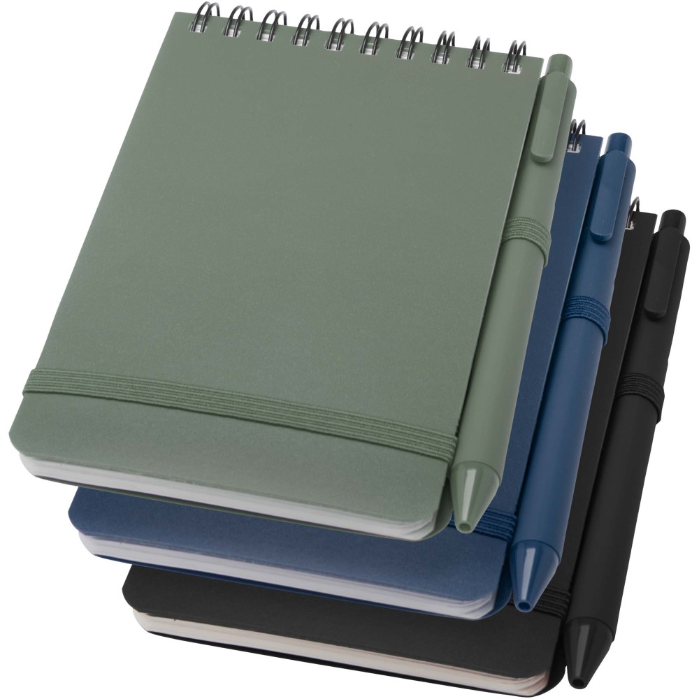 Thalaasa A6 keményfedeles jegyzetfüzet óceánból származó újrahasznosított műanyagból készült, és 80 vonalas, 70 g/m2 krémszínű lapot tartalmaz. A jegyzetfüzet lekerekített sarkokkal, elasztikus zárással és tolltartóval rendelkezik. A fekete tintával író golyóstoll szintén óceánból származó újrahasznosított műanyagból készült. Íráshossz: 1000 méter. Tollhegy mérete: 1,0 mm.