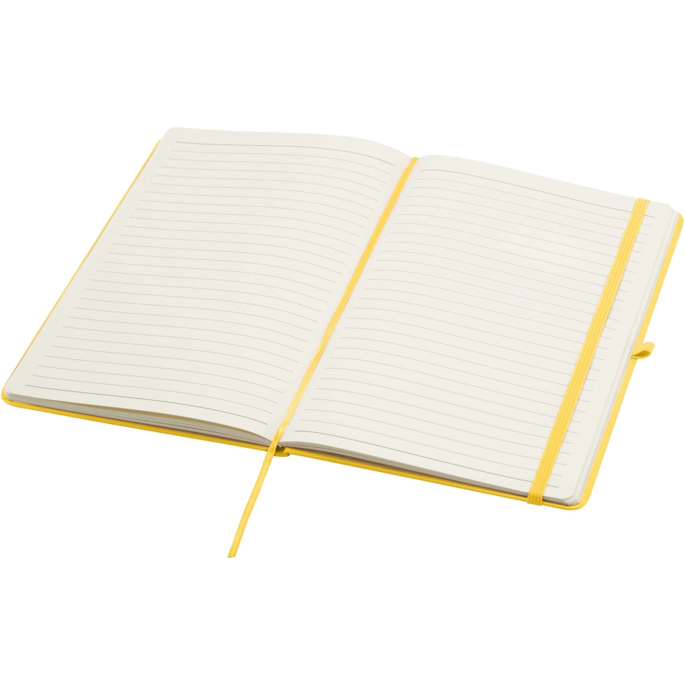 A Spectrum Plus A5 keményfedeles jegyzetfüzet lekerekített sarkokkal nemcsak az irodai mindennapok elengedhetetlen kelléke, hanem remek lehetőség márkád népszerűsítésére is. A jegyzetfüzet puha tapintású borítóval rendelkezik és 80 vonalas, krémszínű, 70 g/m2-es lapból áll, amely tökéletes gyors ötletek vagy hosszabb jegyzetek rögzítésére. A jegyzetfüzet tolltartó hurokkal, gumiszalagos záródással, könyvjelzővel és harmonikazsebbel van ellátva.