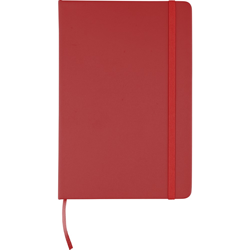 A5-ös méretű jegyzetfüzet rPET PU anyagból készült kemény borítóval, 80 vonalas lappal (70g/m2), színben illeszkedő gumipánttal és könyvjelző szalaggal. Az újrahasznosított anyagra utaló dombornyomott logóval a füzet hátoldalán.
