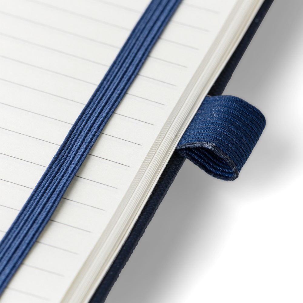 RPET 600D poliészterből készült, PU bevonatú, A5-ös jegyzetfüzet. 80 lap, 70 g/m2 vonalas papír, könyvjelző szalaggal, gumipánttal és tolltartó hurokkal. Félkemény borítású kialakítás. A hátoldalon dombornyomott recycled (újrahasznosított) alapanyagra utaló logó található.