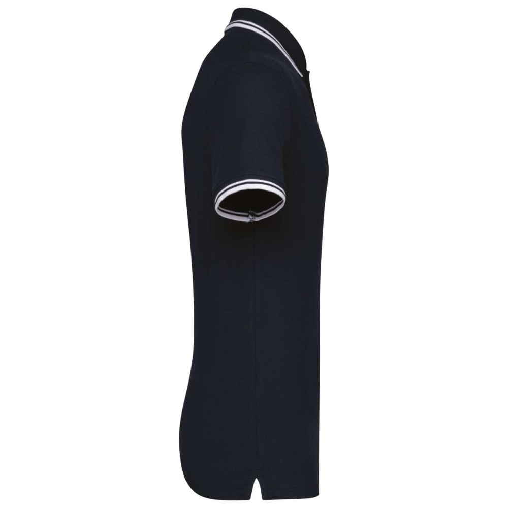100% fésült pamut (márványos színek esetén 92% pamut / 8% viszkóz). Piqué kötött, karcsúsított fazon. Gombzár a nyakkivágásnál, 2 tónusos gombbal. A nyakkivágásnál saját anyagából ragasztott nyak. Díszített oldalslicc, bordás szegély kontrasztos díszítéssel a nyakkivágásnál és a mandzsettánál. Az alsó szegélyen dupla öltéses kivitel.