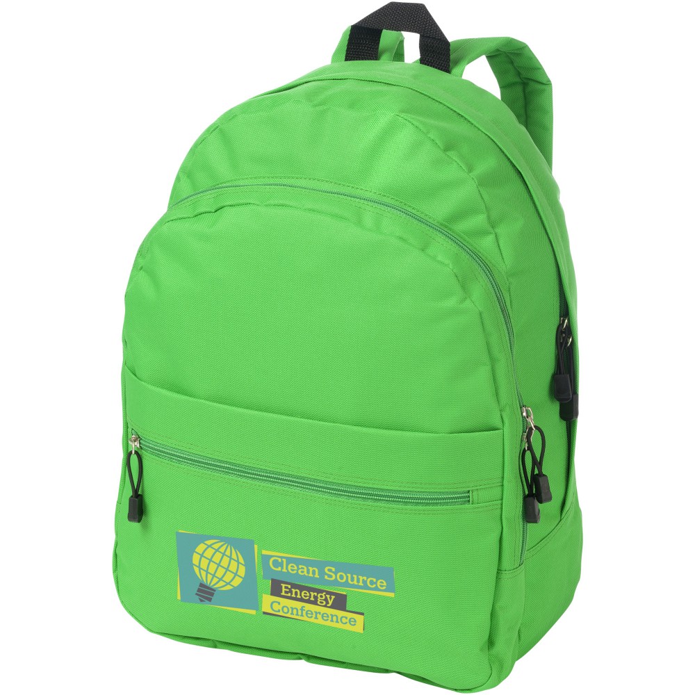 A kényelmes Trend hátizsák nyerő a promóciós hátizsákok között. A divatos kialakítású táska négy rekesszel rendelkezik: két cipzáras rekesszel, egy elülső cipzáras zsebbel és egy tépőzáras elülső zsebbel, így bőséges helyet kínál nagy és kis tárgyak tárolására egyaránt. A termék 600D poliészterből készült.