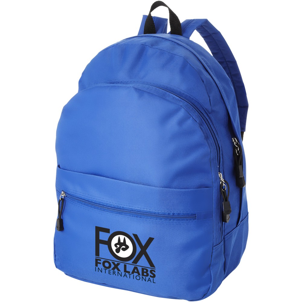 A kényelmes Trend hátizsák nyerő a promóciós hátizsákok között. A divatos kialakítású táska négy rekesszel rendelkezik: két cipzáras rekesszel, egy elülső cipzáras zsebbel és egy tépőzáras elülső zsebbel, így bőséges helyet kínál nagy és kis tárgyak tárolására egyaránt. A termék 600D poliészterből készült.