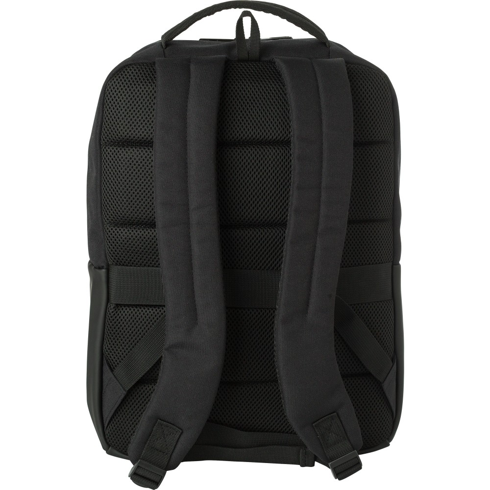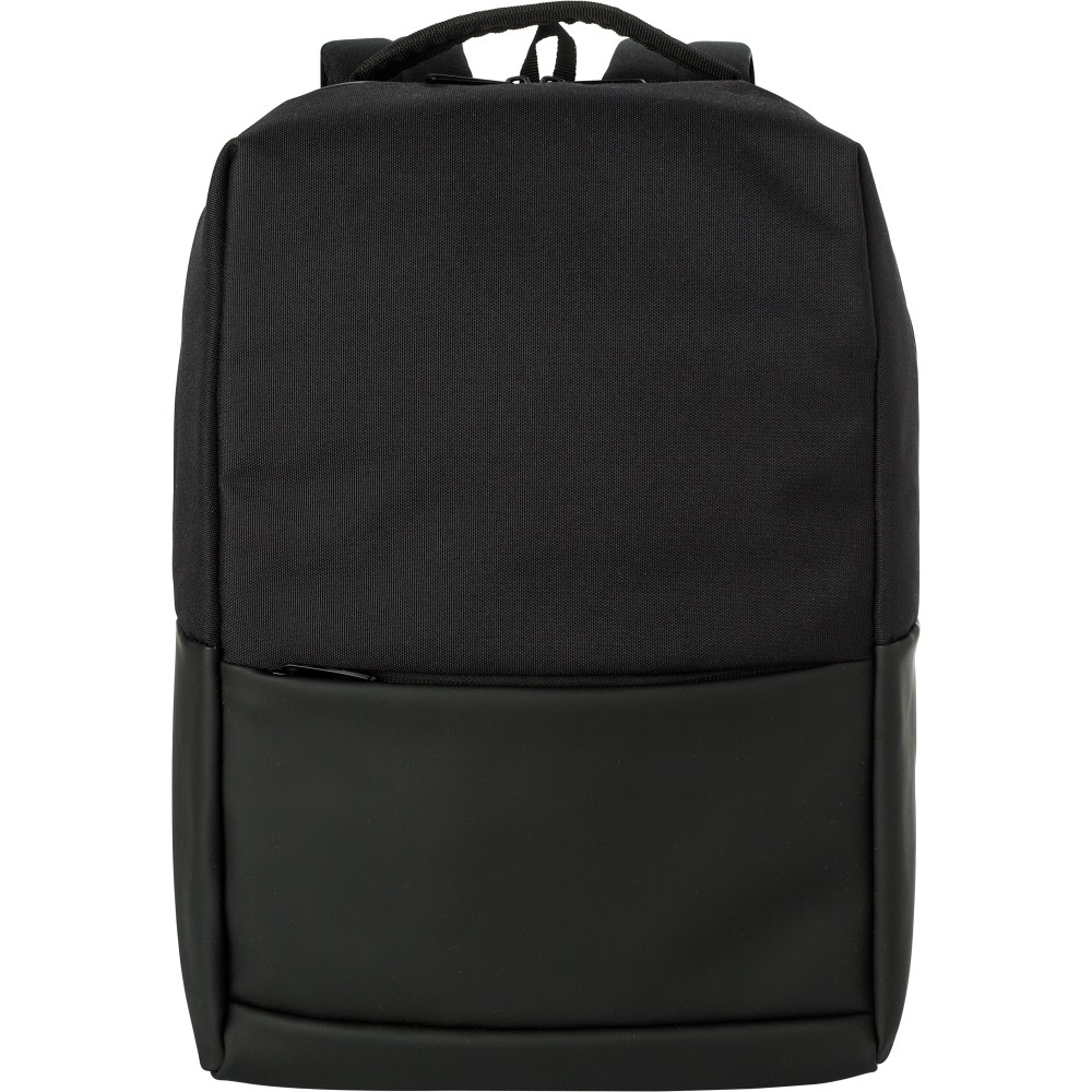 Poliészter (600D) laptophátizsák (15 colos). Egy nagy cipzáras rekesz a tetején, belül több rekesszel. Kis cipzáras rekesz az elején. Megerősített hátoldal és állítható pántok.