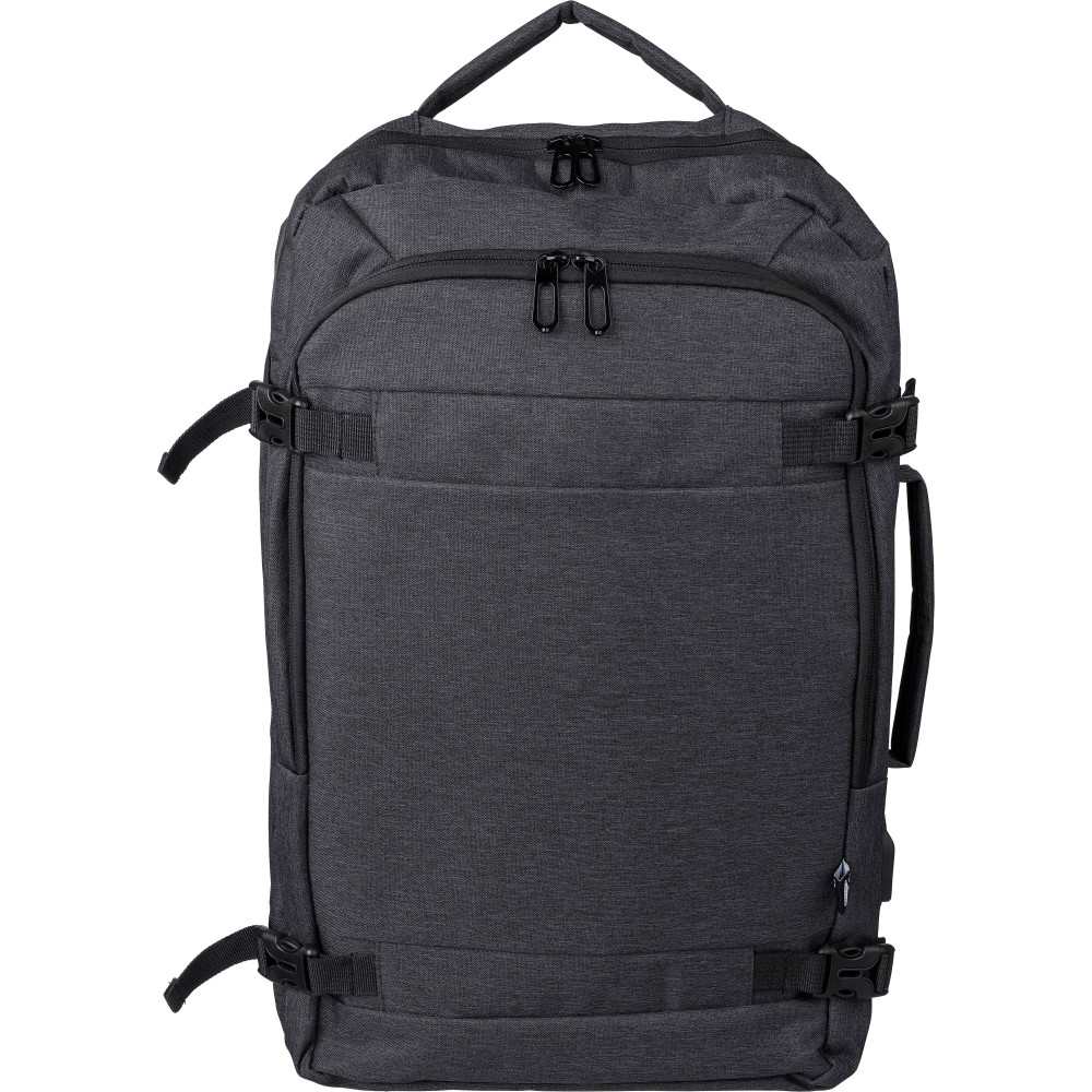 Hátizsák és laptoptáska 17"-es készülékhez. Kézipoggyász méretű. Hordozófüllel a tetején és oldalain. Tépőzáras laptop rekesszel, lopásgátló zsebbel és két nagy cipzáras rekesszel. Szellőző, párnázott hátoldallal, bőröndre húzható pánttal, zárócsatokkal és oldalsó USB-A porttal rendelkezik. Oldalsó csatok segítik a csomag kompakt tartását. Terhelhetősége kb. 12 kg. RPET alapanyagra utaló címke. Anyaga: 300D rPET poliészter.