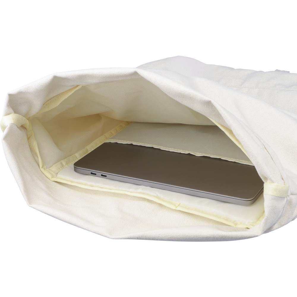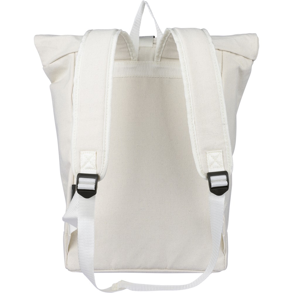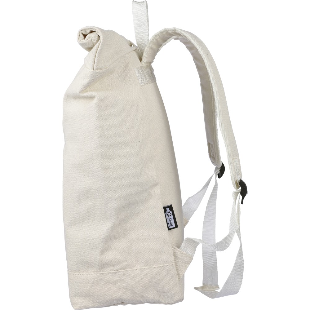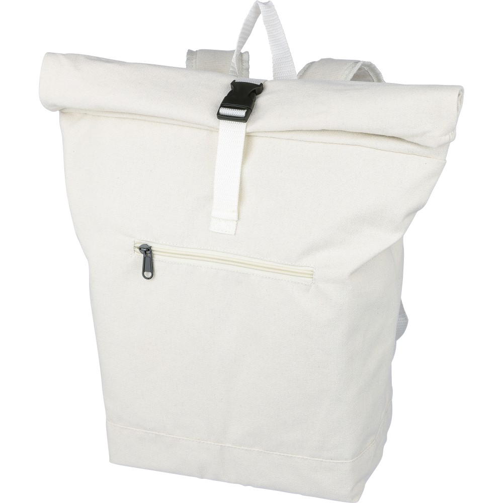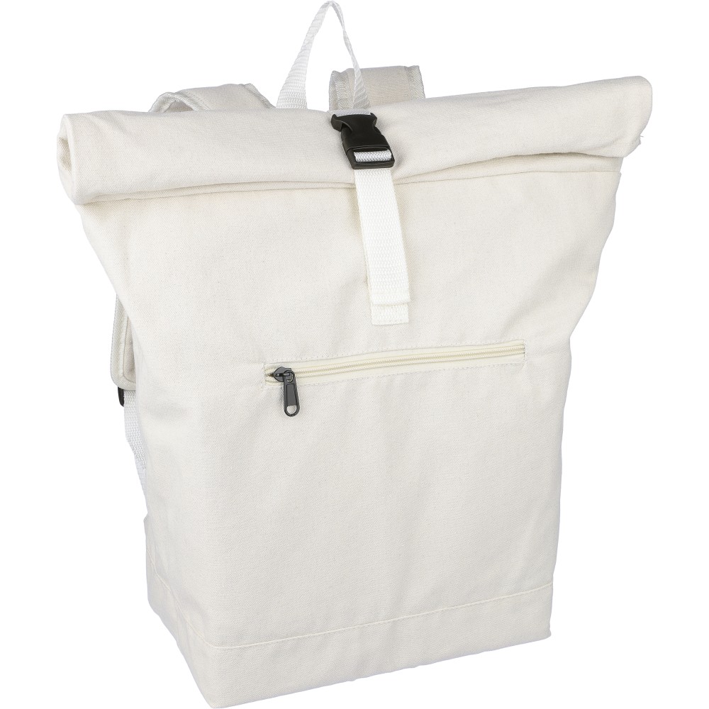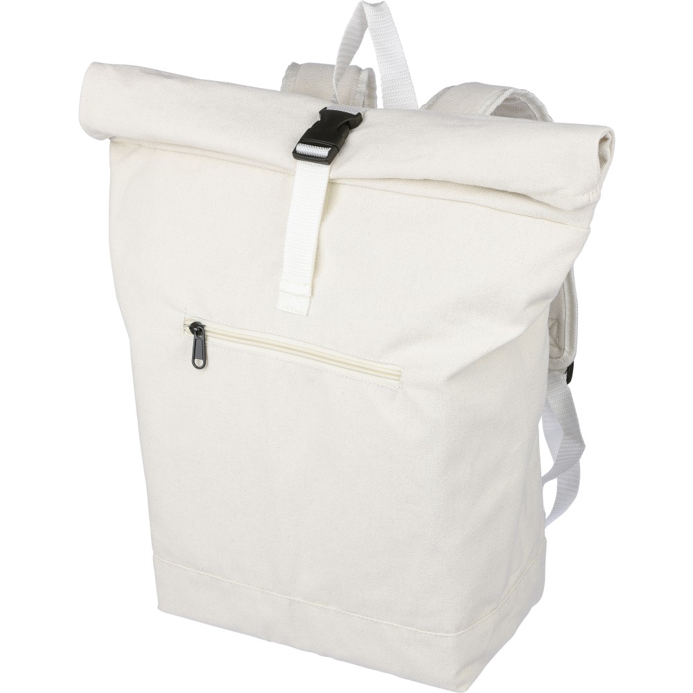 Rolltop hátizsák 330 g/m2 újahasznosított policotton anyagból, 210D poliészter béléssel és műanyag csattal. 15 literes űrtartalommal, egy nagy cipzáras rekesszel, 15"-es laptoptartó résszel, két belső és egy külső rekesszel. Tetején hordozófüllel, párnázott, állítható vállpánttal és egy kicsi, cipzáras elsőzsebbel. Teherbíró képessége 14 kg. Címkét tartalmaz.