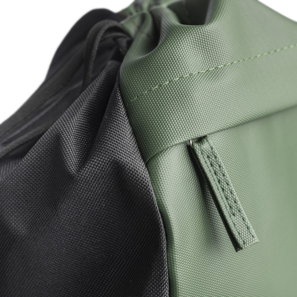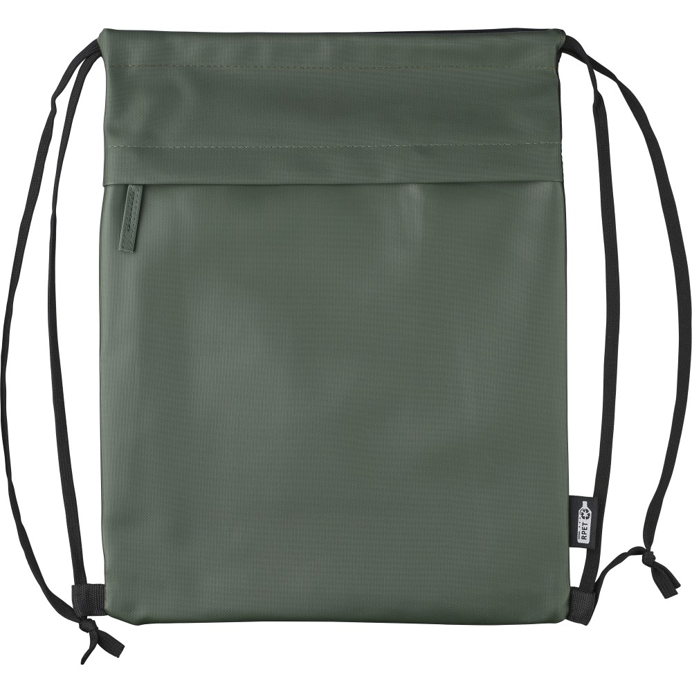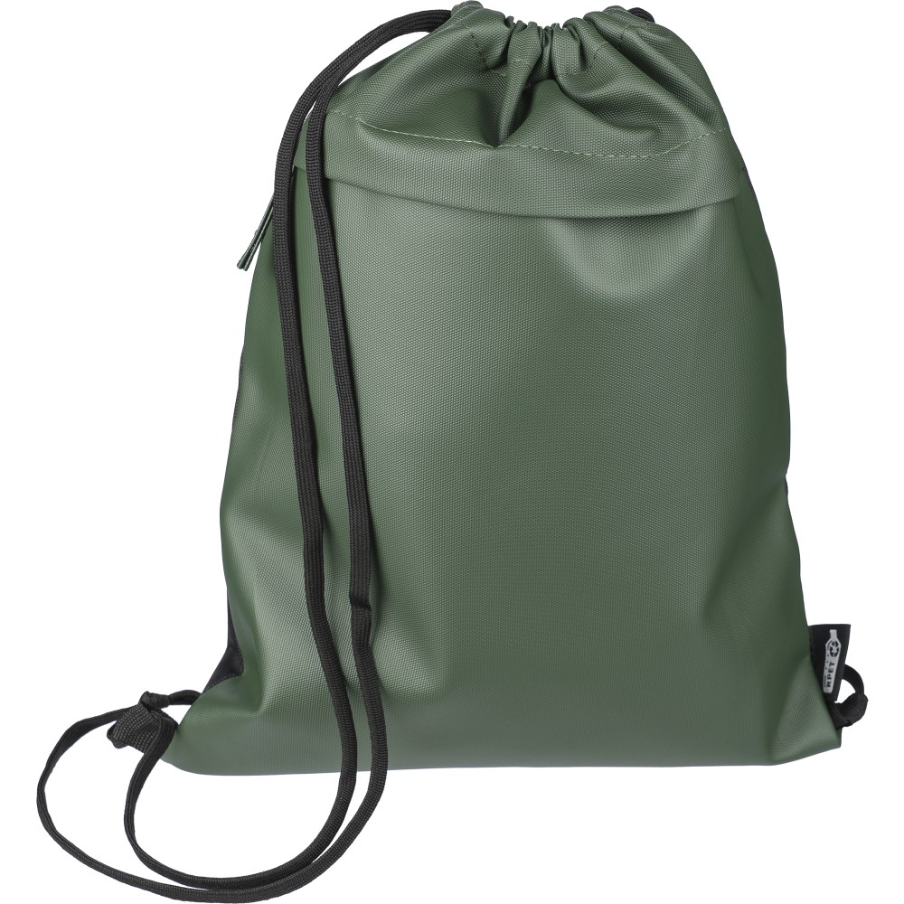 600D rPET poliészter tornazsák. Az elejét PU bevonat teszi vízlepergetővé. Rejtett cipzáras első zsebbel, két tárolórésszel, első és belső zsebekkel. Kapacitása 8 liter, teherbírása 8 kg. Oldalán rPET címkével.