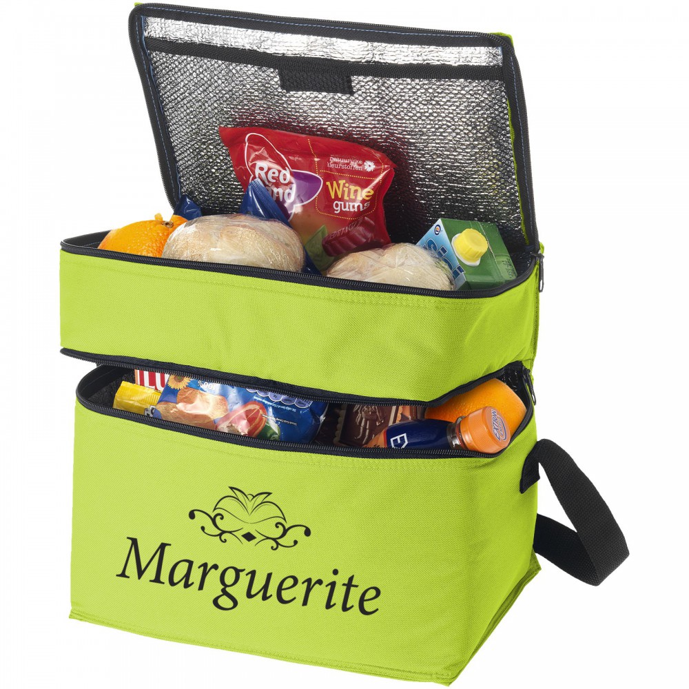 Az Oslo hűtőtáskával bármikor és bárhol hűtött italokat és harapnivalókat biztosíthat. A hűtőtáska két különálló cipzáras rekesszel rendelkezik. A felső része tökéletes az apró falatok tárolására, az alsó része pedig a nagyobb élelmiszerek tárolására. A vállpánt állítható, így a táskát mindenki könnyen hordozhatja. A hűtőtáska 600D poliészterből készült, amely egy nagy teherbírású és tartós szövet.