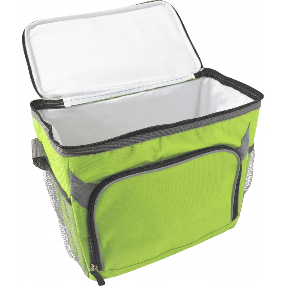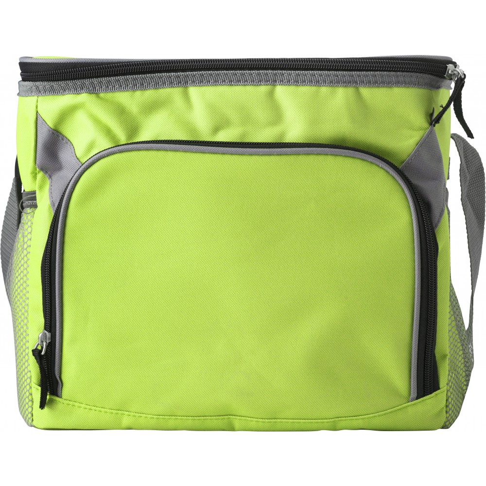 Hűtőtáska nagy cipzáros elsőzsebbel és mindkét végén hálós zsebekkel. 600D poliészter.