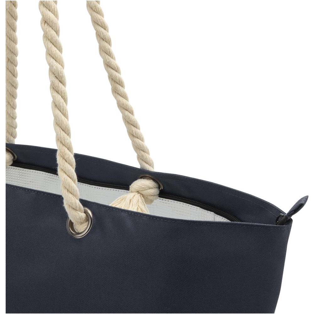 A Panama hűtőtáska GRS tanúsítvánnyal rendelkező újrahasznosított poliészterből készült, és nagy, cipzáras főrekesszel van ellátva. Kiváló minőségű alumínium fóliával bélelt belső résszel és pamut fülekből áll. Ideális bevásárláshoz, strandoláshoz vagy egy parkbéli kiránduláshoz. Űrtartalma: 23 liter. Teherbírás: akár 10 kg. PVC-mentes.