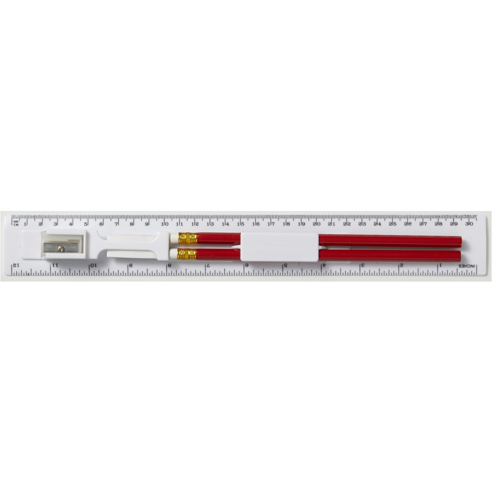 30 cm-es vonalzó és írószerkészlet. Ceruzák, ceruzahegyező, radír. A ceruzák H keménységűek.
