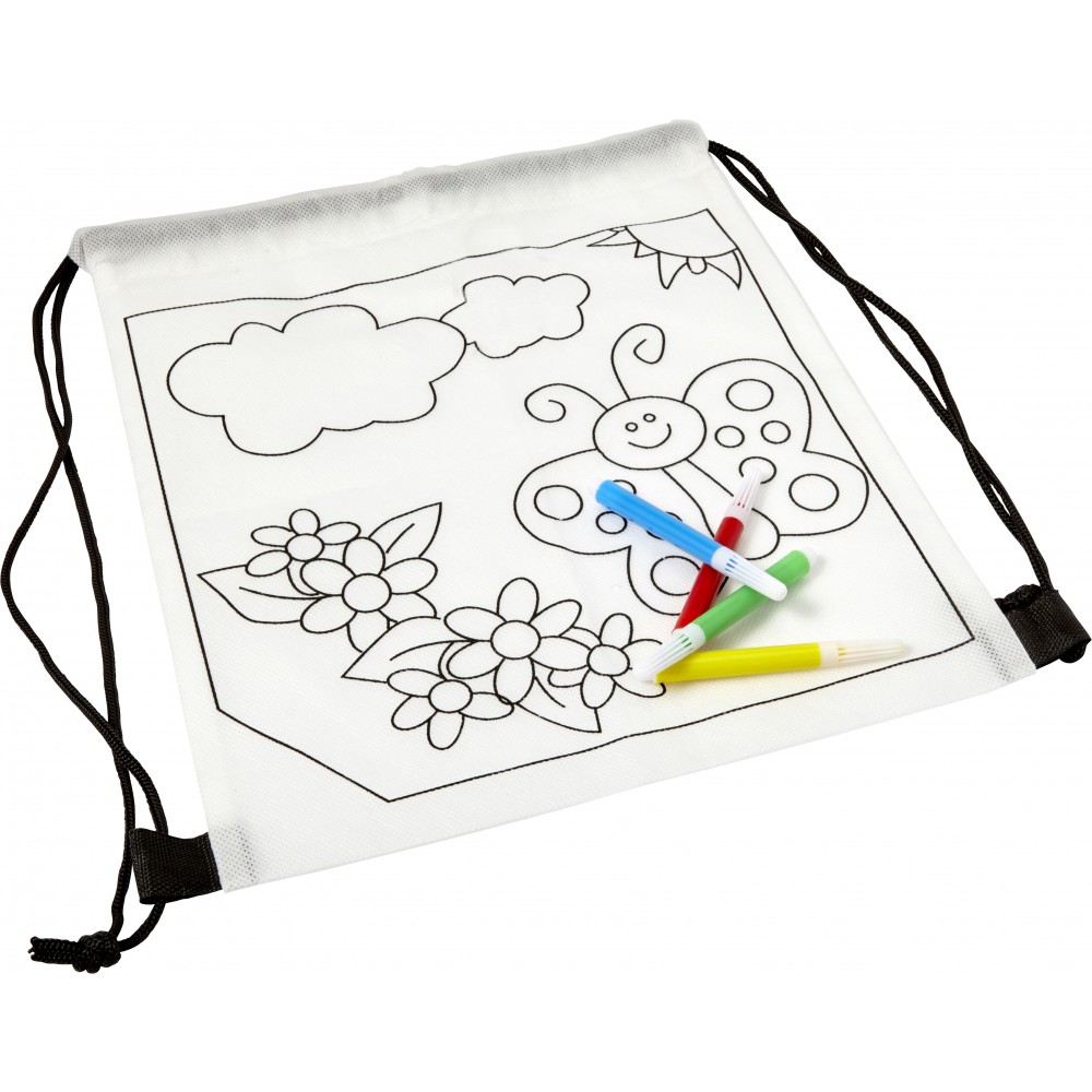 Kifesthető tornazsák húzózsinórral, 4 db filctollal. Nemszőtt anyag.