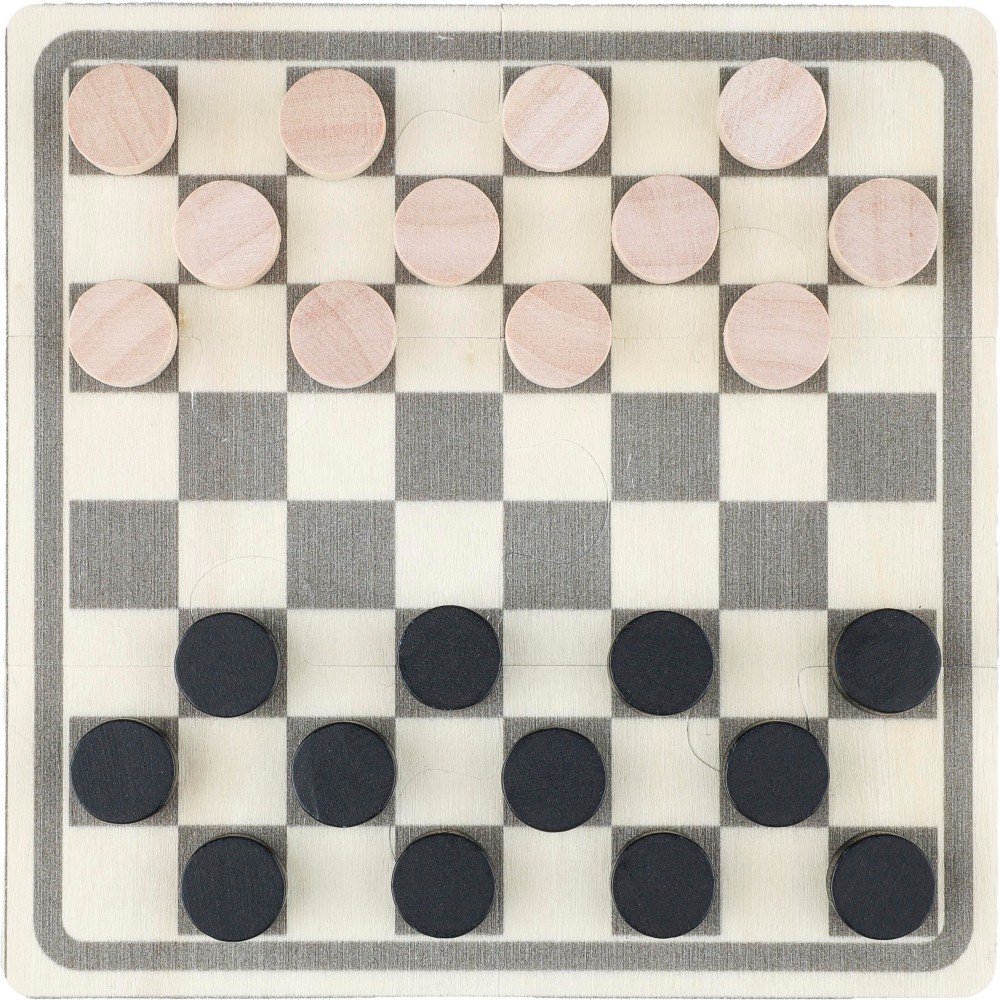 Fa sakk- és dámajáték pamut zsinóros tasakban. Tartalmaz egy 6 darabból álló, nyomtatott puzzle-t, amely összerakható a játéktábla létrehozásához, valamint 16 nyomtatott fa zsetont, amelyek sakkfigurákat ábrázolnak. A játéktér anyaga rétegelt lemez, a zsetonok anyaga fenyőfa.