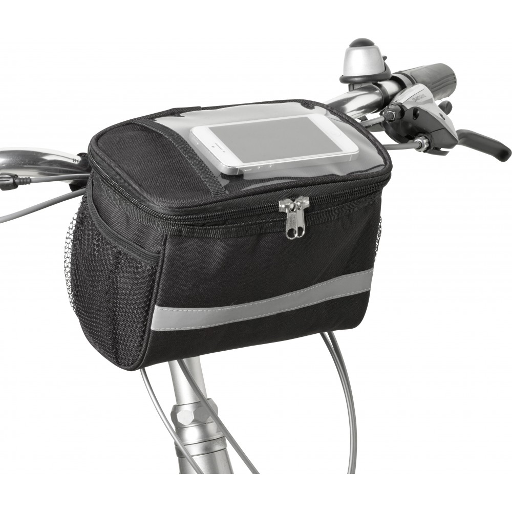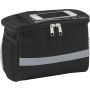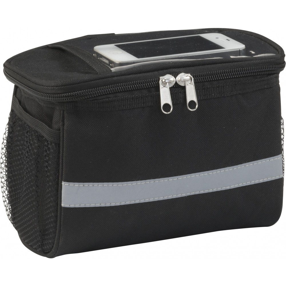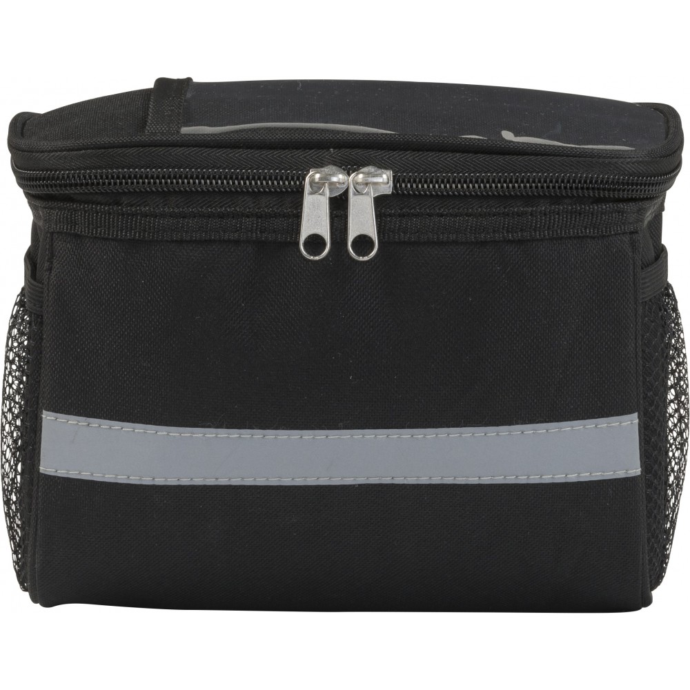 Kerékpáros hűtőtáska 600D poliészterből, PEVA béléssel, a tetején PVC zsebbel. Fényvisszaverő pánttal, mindkét oldalán hálós zsebekkel és nagy, cipzáros hűtőrekesszel.