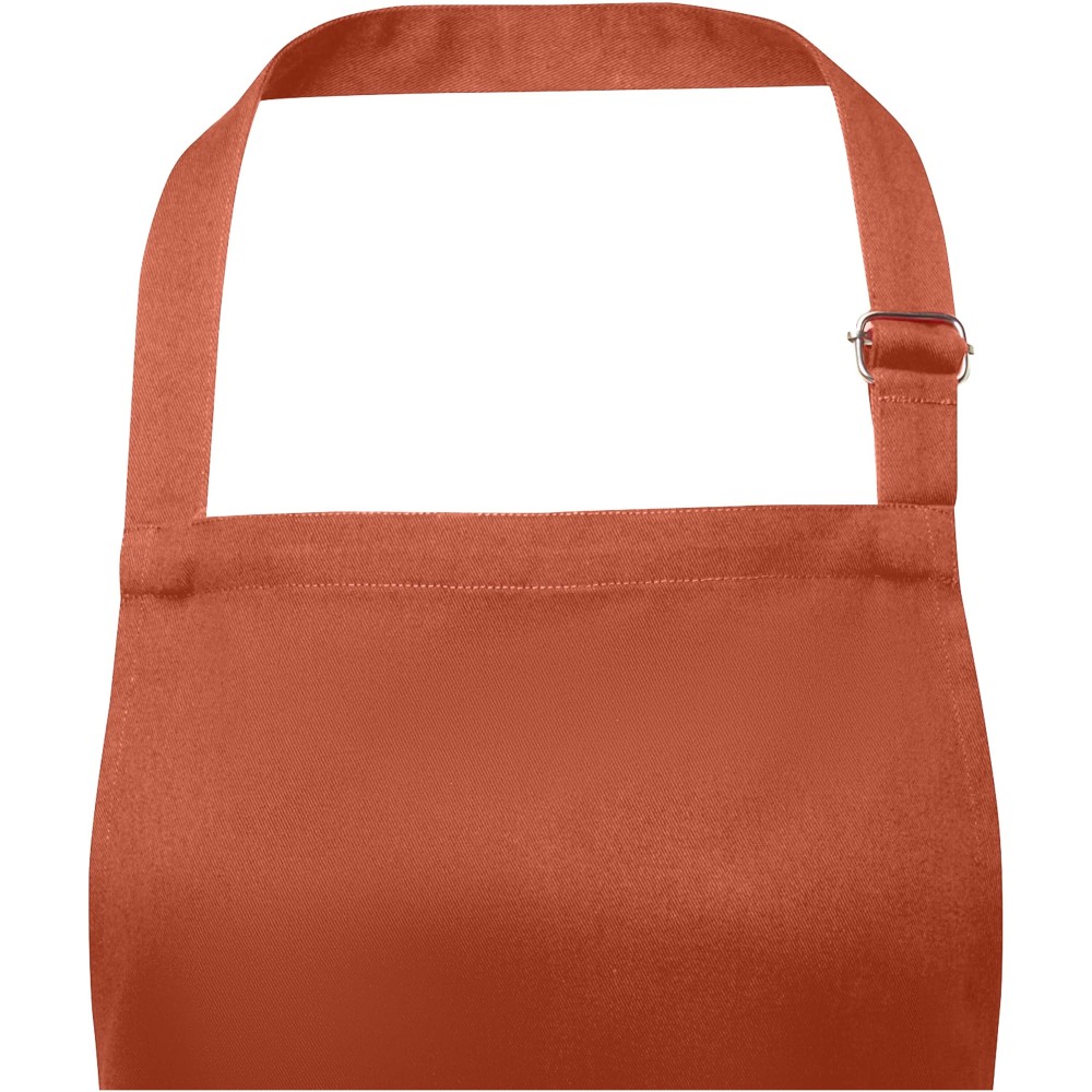 Vastag és masszív anyag, ugyanakkor puha és kényelmes viselet. A két elülső zseb gyors és egyszerű módot kínál a konyhai eszközök tárolására. A kötény nyakában csattal állítható, hátul megköthető. Nagyméretű nyomtatási lehetőség a logók megjelenítéséhez. Pamut twill 65% poliészterből és 35% pamutból, 240 g/m2.