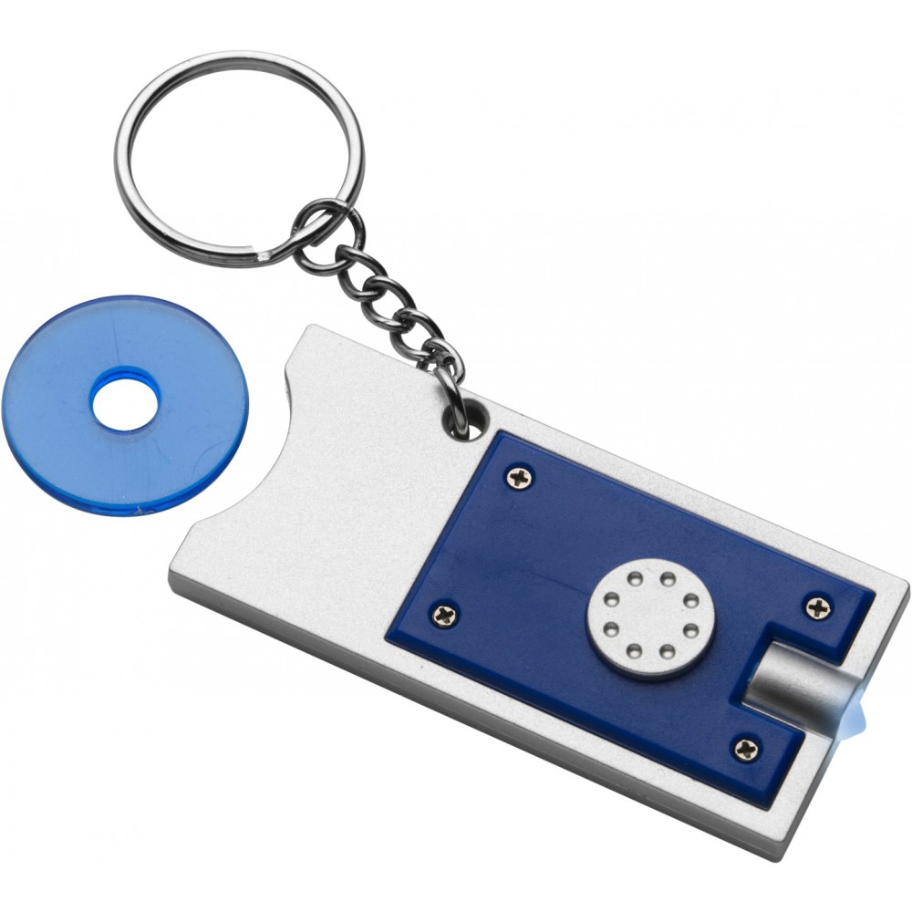 Világítós kulcstartó érmetartóval, ezüst/kék