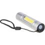 Újrahasznosított alumíniumból készült COB zseblámpa (80-100 lumen) 3 világítási móddal, nyomógombbal, csuklópánttal és gravírozott recycled (újrahasznosított) alapanyagra utaló logóval. USB-C-n keresztül újratölthető (300 mAh), a csomag része egy 30 cm-es kábel. Illusztrációval ellátott barna dobozba csomagolva.
