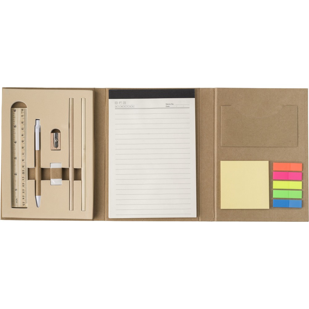 Irodaszermappa tartalma: negyven lapos jegyzetfüzet, bambusz vonalzó (15 cm), karton toll műanyag heggyel, klipsszel és nyomógombbal, kék tollbetéttel, valamint két ceruza, hegyező, radír, öntapadó jelölők (25 lap színenként) és egy belső zseb. Fa, karton, gumi, EVA, papír.