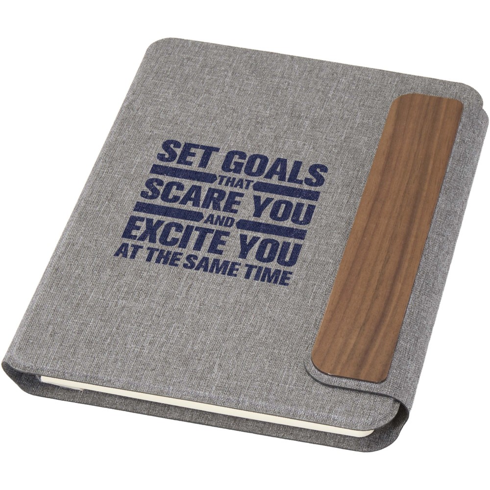 Az Andean A5 portfólió részben RCS tanúsítvánnyal rendelkező, újrahasznosított, fogyasztás utáni poliészterből készül, így fenntarthatóbb alternatívát kínál, csökkentve az új alapanyagok felhasználását. Elegáns, lekerekített sarkú, szürke kemény borítóját precíziós hegesztési technológia és mágneses zárás egészíti ki, amelyet kifinomult diófa részlet díszít, modern és letisztult megjelenést kölcsönözve. Belsejében egy kivehető, puhafedeles jegyzetfüzet található, amely 64 krémszínű, vonalazott, 80 g/m2 tömegű, felelősen beszerzett papírból készült lapot tartalmaz. Kraft színű papírtokban kerül átadásra.