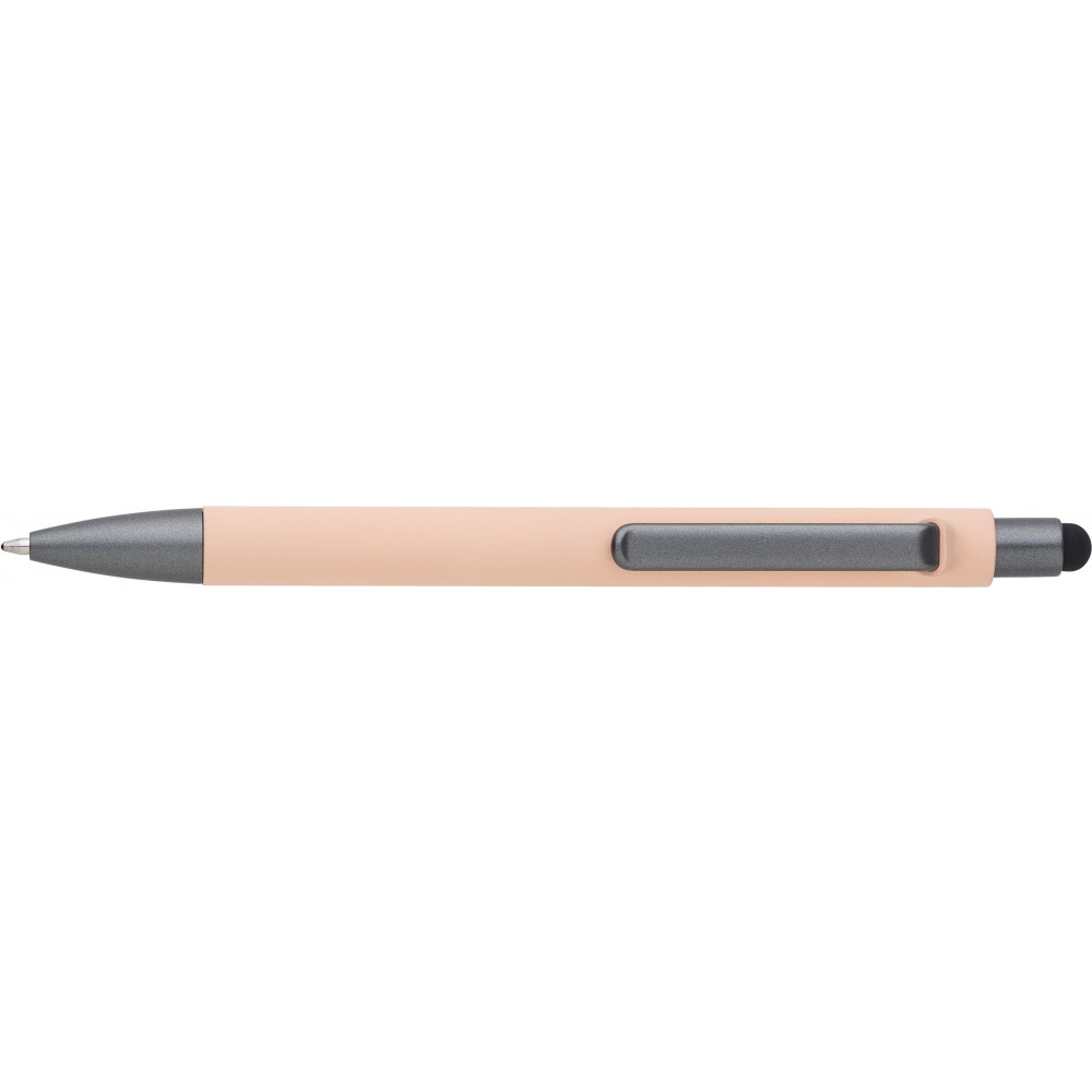 Golyóstoll gumis bevonattal, érintővel, kék tollbetéttel. ABS, PP műanyag, szilikon, vas.