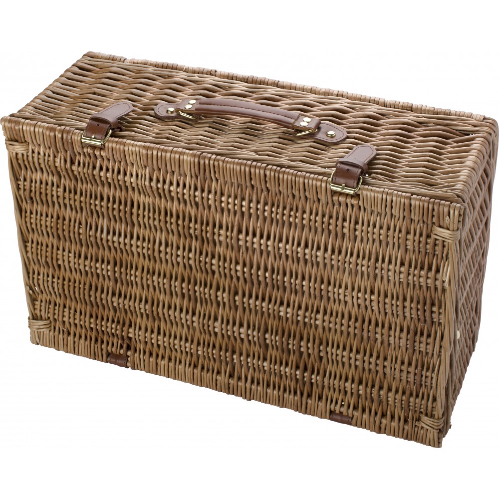 Piknikkosár 4 fő részére. Rozsdamentes acél evőszközök műanyag nyéllel, 4 darab kerámia tányér és 4 darab 0,21 literes kerámia bögre. A termék természetes anyagokból készült, ezért méreteiben eltérések adódhatnak.
