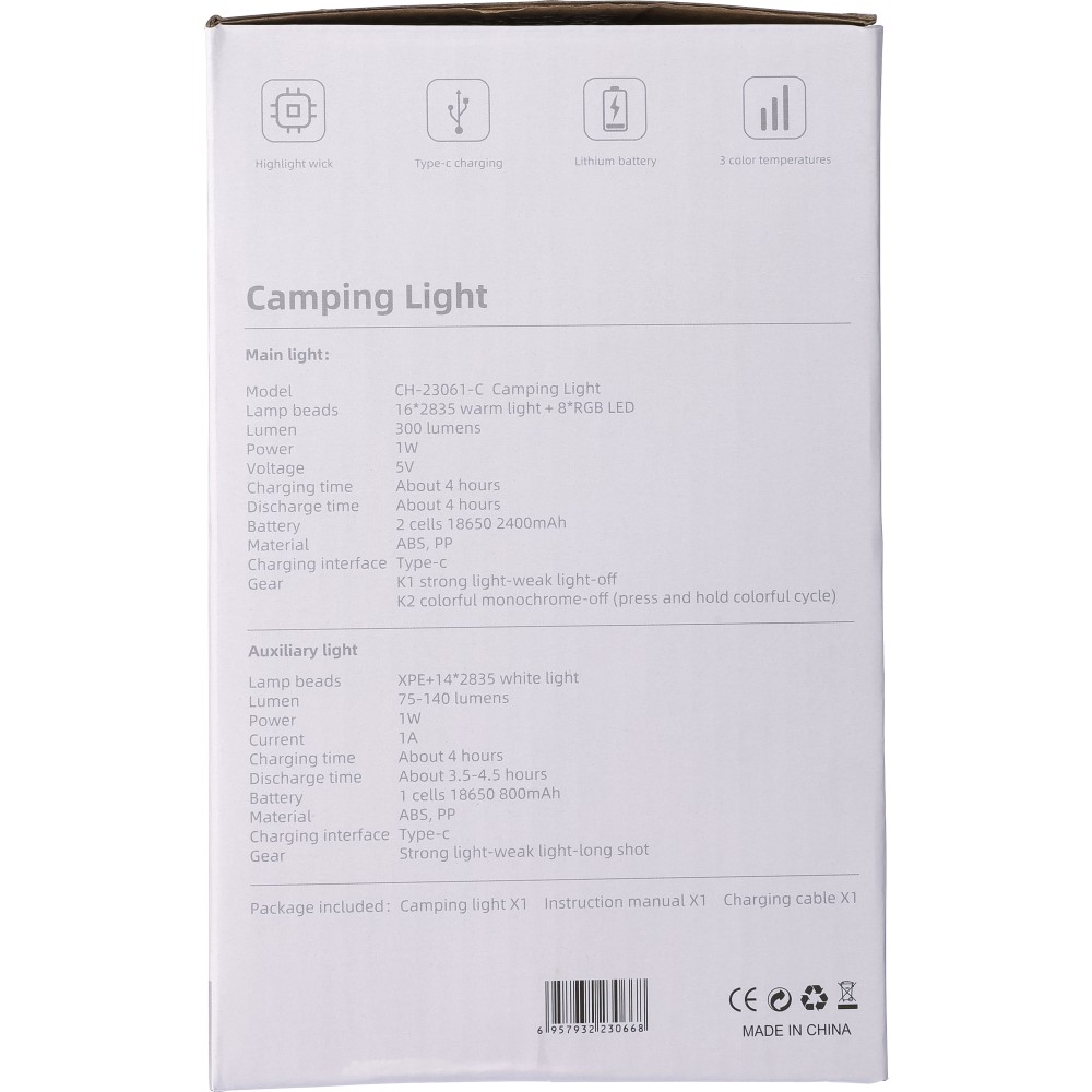 Multifunkciós lámpa kempingezéshez. Levehető elemlámpával, karabinerrel, 4 világítási móddal. 8-féle színben világít, melyek közül a fehér kétféleképpen is működtethető. A másik 7 szín váltakozóra is beállítható a gomb nyomvatartásával. Az elemlámpa 800 mAh-s, a kempinglámpa 2400 mAh-s akkumulátorral rendelkezik. C-típusú csatlakozók. Csomagolása papírdoboz.