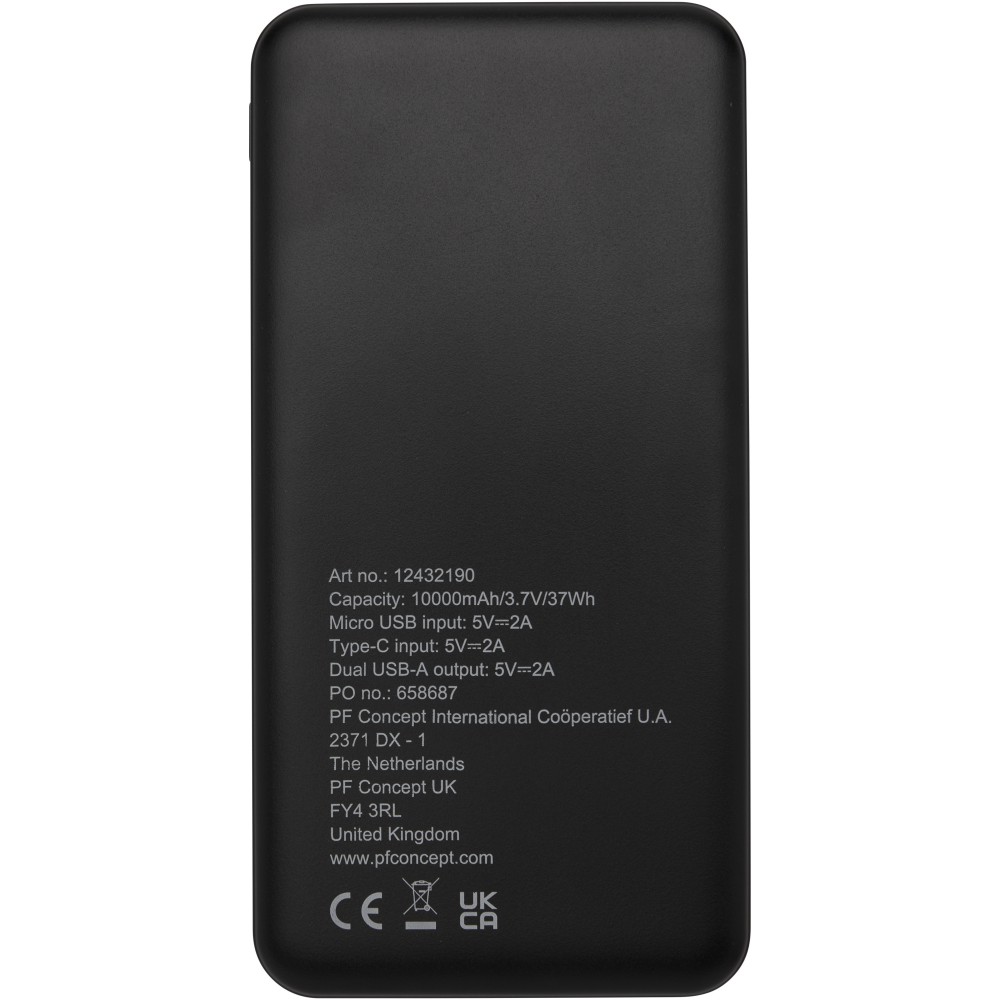 Újrahasznosított ABS műanyagból készült powerbank. A powerbank hosszú élettartamú, A minőségű 10.000 mAh lítium-polimer akkumulátort tartalmaz a gyors töltéshez. A teljesítményjelzők jelzik a töltöttségi szintet. Type-C bemenet 5V/2A, Micro USB bemenet 5V/2A, kettős USB-A kimenet 5V/2A, teljes teljesítmény 10W. Szállítása egy 30 cm-es TPE 2A USB-A-Type-C töltőkábellel, kraftpapír díszdobozban történik.