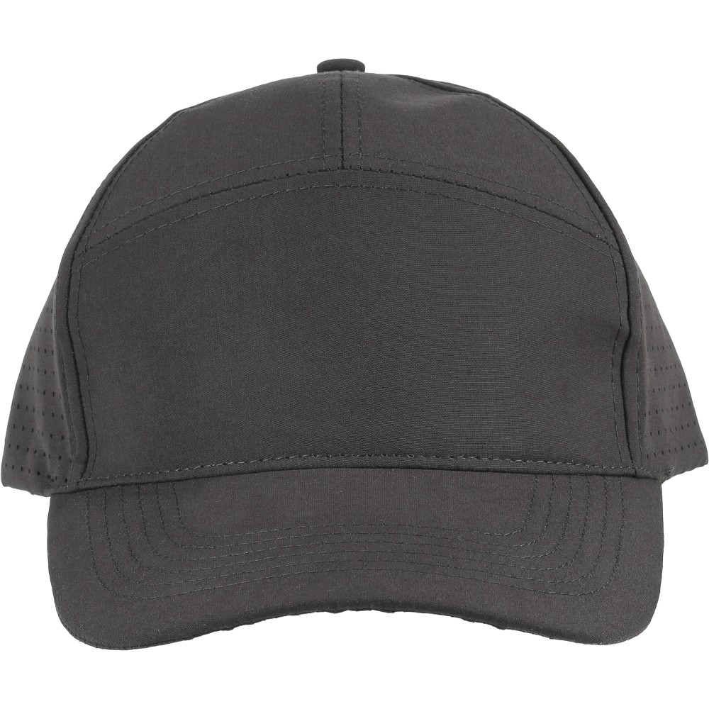 7 paneles poliészter baseballsapka lézervágott szellőzőnyílásokkal a hátsó paneleken. 7 cm-es ellenzővel, tépőzárral állítható pánttal, PU címke nélkül.