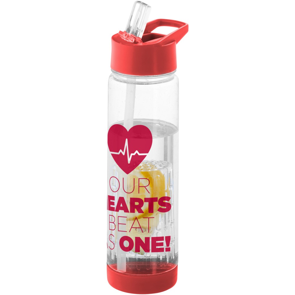 Tutti Frutti palack szűrőbetéttel, csavaros kupakkal, felpattintható ivócsővel. A szűrőbetétnek köszönhetően italunkba könnyen szűrhető módon tehetünk gyümölcsöt, zöldfűszert, zöldséget: mentát, citromfüvet, uborkát, levendulát, stb. A palack Eastman Tritan anyagból készült, így BPA-mentes, könnyű, tartós, szagmentes és ütésálló. Nem szivárgásmentes. Szénsavas italokkal nem használható. Mosogatógépben nem mosható és mikrohullámú sütőben történő melegítésre nem alkalmas. Űrtartalom: 740 ml.