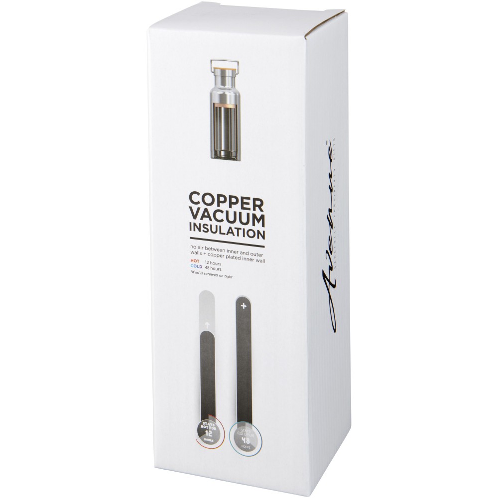 Duplafalú, vákuumos, réz szigetelésű sportpalack 480 ml űrtartalommal. Műanyagot nem tartalmaz. Hidegtartó képesség 48 óra, melegtartó képesség 12 óra. A duplafalas kialakításnak köszönhetően nincs párakicsapódás. Szivárgásmentes. Szénsavas italokkal nem használható. Mosogatógépben nem mosható és mikrohullámú sütőben történő melegítésre nem alkalmas. Csomagolása Avenue díszdoboz. Rozsdamentes acél.