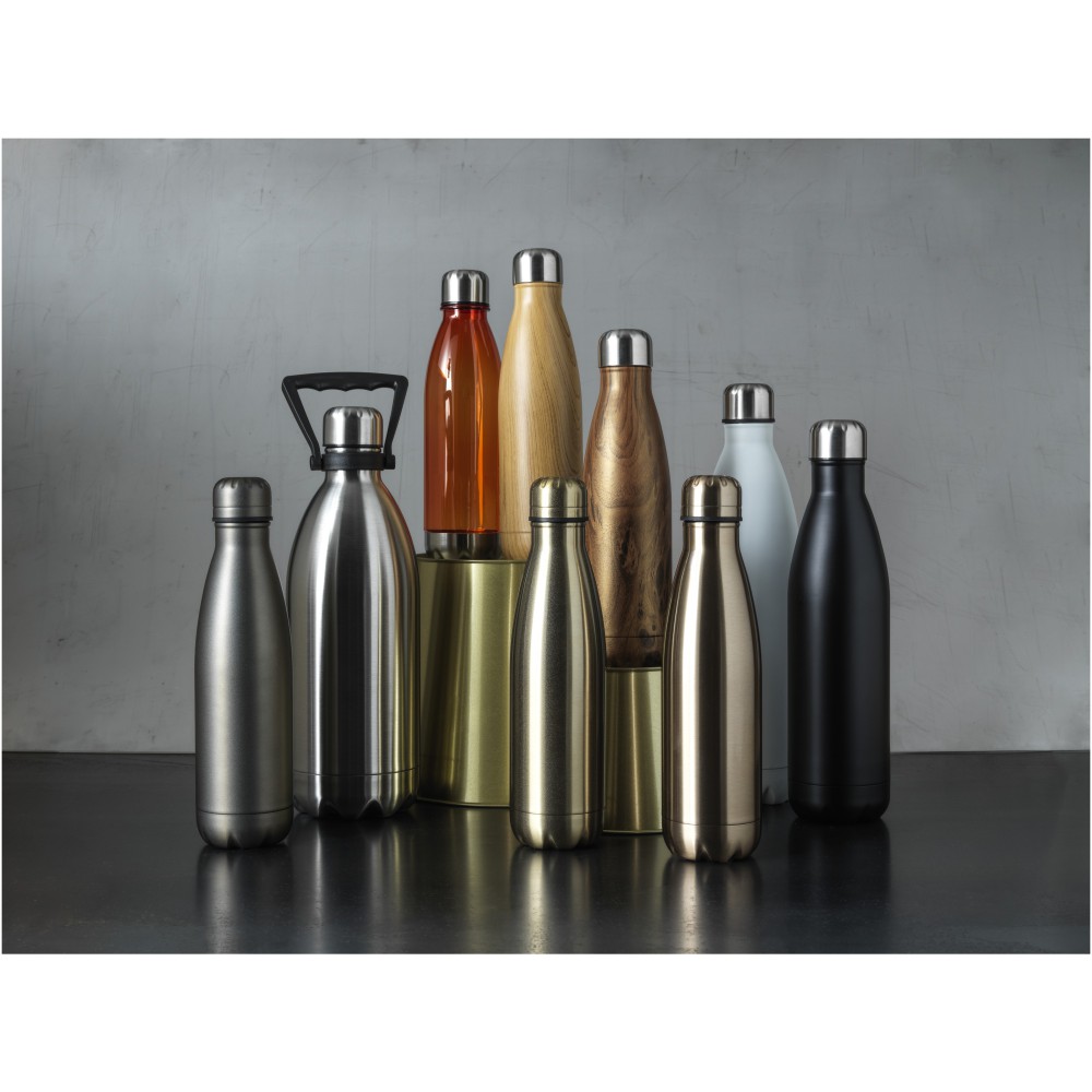 Nagyméretű, vákuumszigetelt rozsdamentes acél palack ikonikus dizájnnal. A szigetelt 18/8-as rozsdamentes acél több órán keresztül melegen vagy hidegen tartja az italokat. BPA-mentes, a német élelmiszerbiztonsági törvény (LFGB) szerint tesztelt és jóváhagyott. Ftaláttartalomra tesztelve és jóváhagyva a REACH előírásai szerint. Szivárgásmentes. Szénsavas italokkal nem használható. Mosogatógépben nem mosható és mikrohullámú sütőben történő melegítésre nem alkalmas. Nagy űrtartalmú palack: 1L. Újrahasznosított karton díszdobozban.