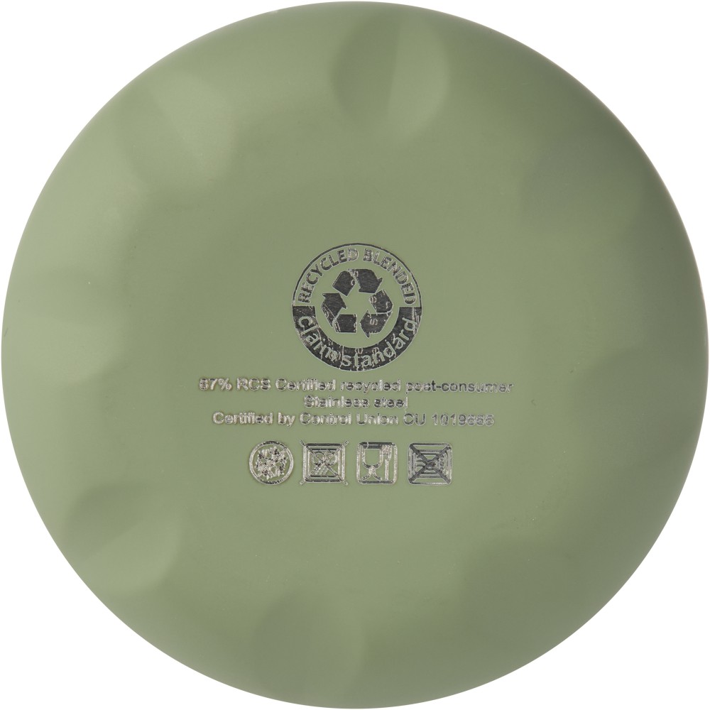 Vákuumszigetelt, RCS tanúsítvánnyal rendelkező, újrahasznosított rozsdamentes acél palack ikonikus dizájnnal, amely több órán keresztül tartja melegen vagy hidegen az italokat. A legtöbb pohártartóba illeszkedő talppal ellátott, elegáns megjelenésű vizes palack tökéletes promóciós termék. A német élelmiszer-biztonsági jogszabályok (LFGB) szerint, valamint a REACH-szabályozásnak megfelelően ftalát-tartalomra tesztelt és jóváhagyott. Űrtartalma: 500 ml. Újrahasznosított kartonból készült díszdobozban szállítjuk.