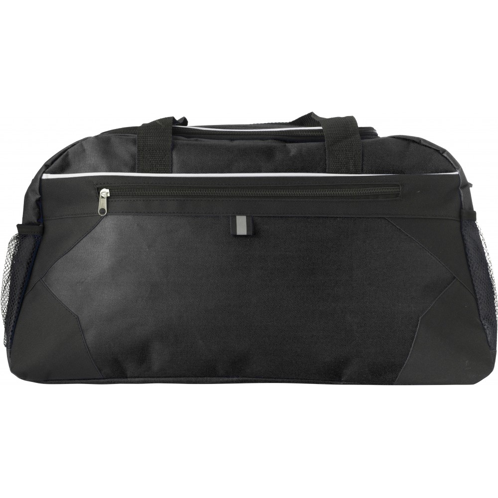 Sport- és utazótáska cipzáros elsőzsebbel és mindkét végén hálós zsebekkel. 600D poliészter.