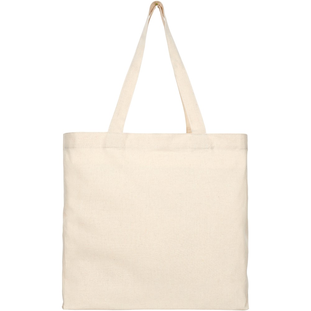 Széles bevásárlótáska 210 g / m2 újrahasznosított pamut és poliészter keverékből. Az újrahasznosított pamut textilipari szabászati hulladékból ered. Az újrahasznosított anyag természetéből fakadóan kisebb eltérések lehetnek a színben. Fülmagasság 31 cm. Terhelhető: 10 kg-ig. Újrahasznosított pamut, 210 g/m2, újrahasznosított poliészter.